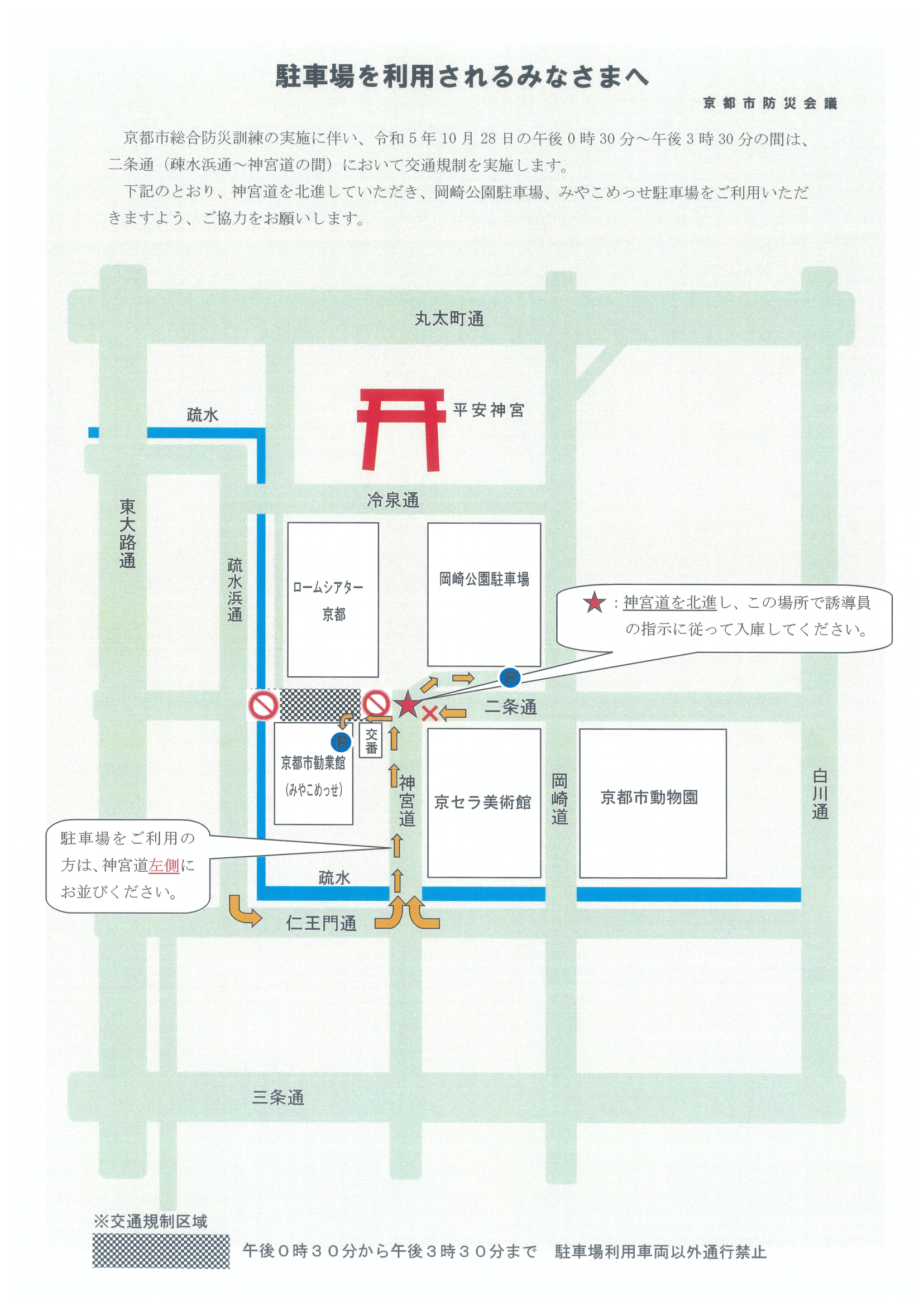 【岡崎公園地下駐車場】京都市総合防災訓練に伴う駐車場への進入方法変更について